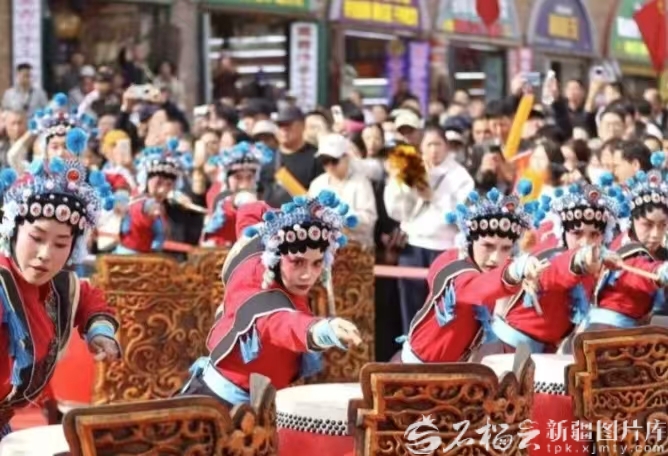 10月1日12時,新疆國際大巴扎步行街化身為一片沸騰的海洋,來自陜西神木的非物質文化遺產代表性項目——“忠勇楊家鼓”在此激情上演,為八方來客獻上一場氣勢磅礴的傳統(tǒng)民俗盛宴。
