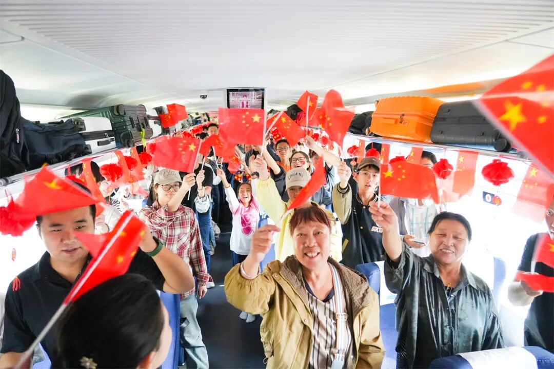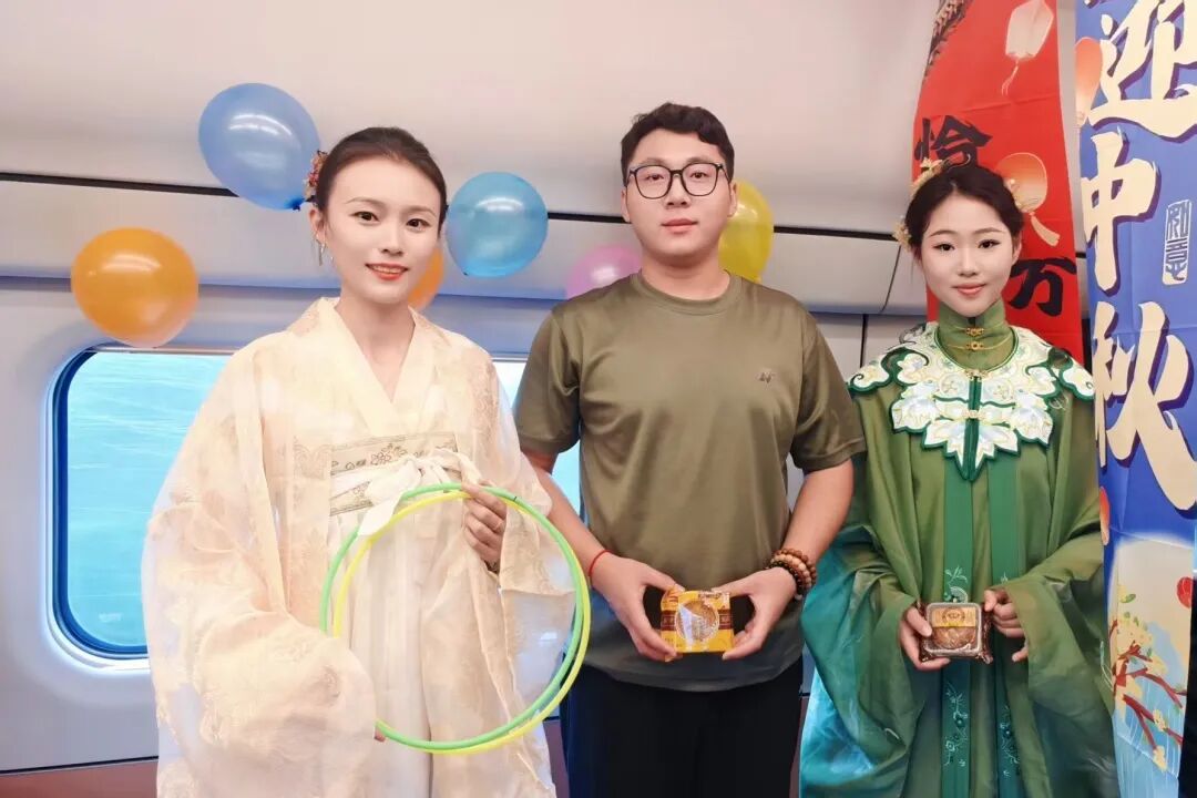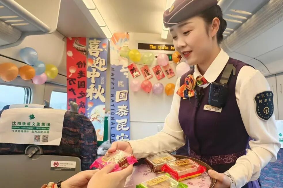 熱鬧的活動(dòng)讓車廂變成歡樂(lè)的海洋,列車員將月餅等精美伴手禮送給旅客,為他們送上節(jié)日的祝福。