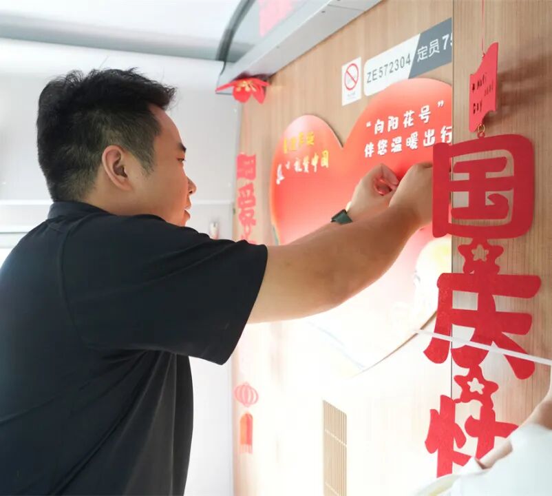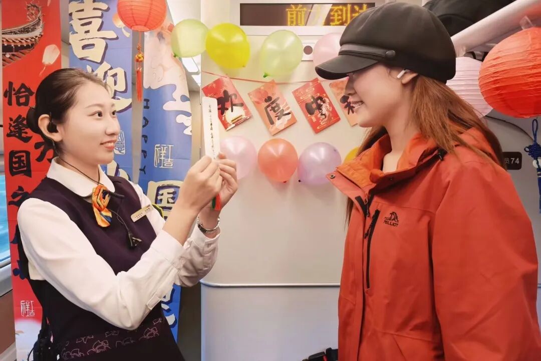 旅客們?cè)谛男伪愫灱埳蠈?xiě)下美好的祝福和期許,并粘貼在車廂“祝福墻”上,記錄下精彩難忘的瞬間。