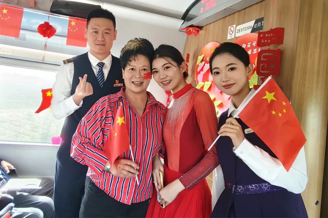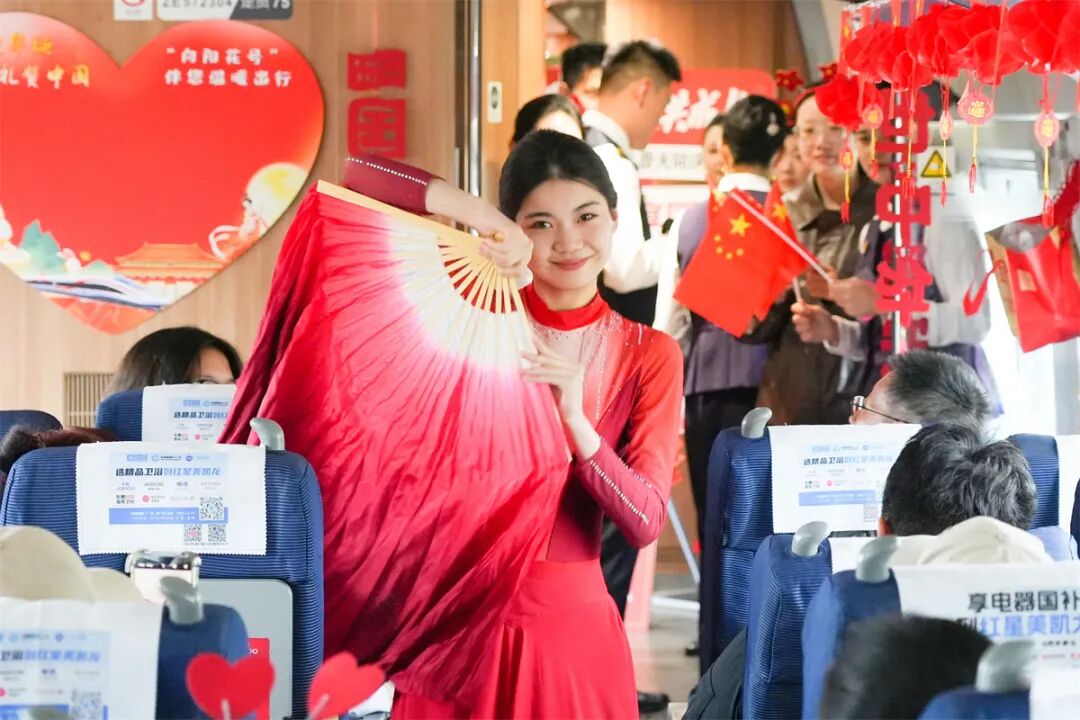 車廂內(nèi)掛滿條幅、彩帶和中國(guó)結(jié),洋溢著節(jié)日的喜慶氛圍。在舞蹈《親愛(ài)的你啊》的優(yōu)美旋律中,列車聯(lián)歡拉開(kāi)序幕。