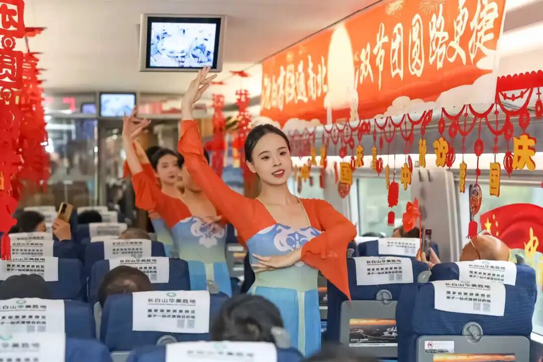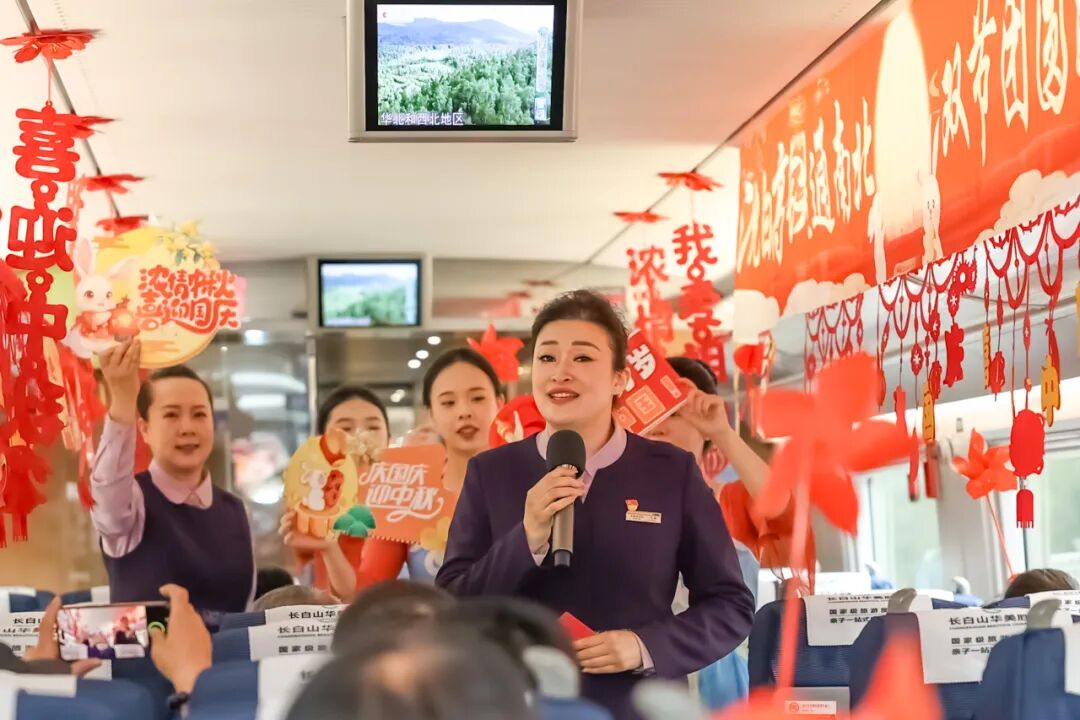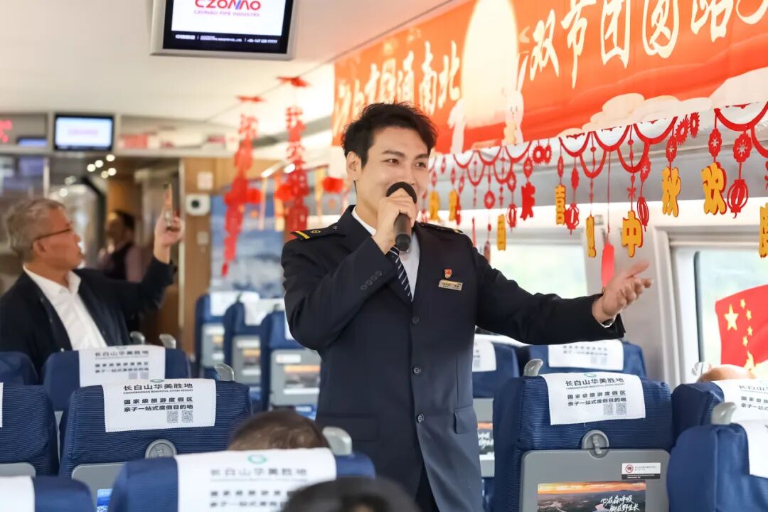 沈佳高鐵沈白段開(kāi)通運(yùn)營(yíng)后,迎來(lái)第一個(gè)國(guó)慶中秋假期。長(zhǎng)春客運(yùn)段在長(zhǎng)春至青島北的G3565次列車上舉辦“‘我的鐵路風(fēng)景’——沈白高鐵通南北 雙節(jié)團(tuán)圓路更捷”列車聯(lián)歡活動(dòng)。