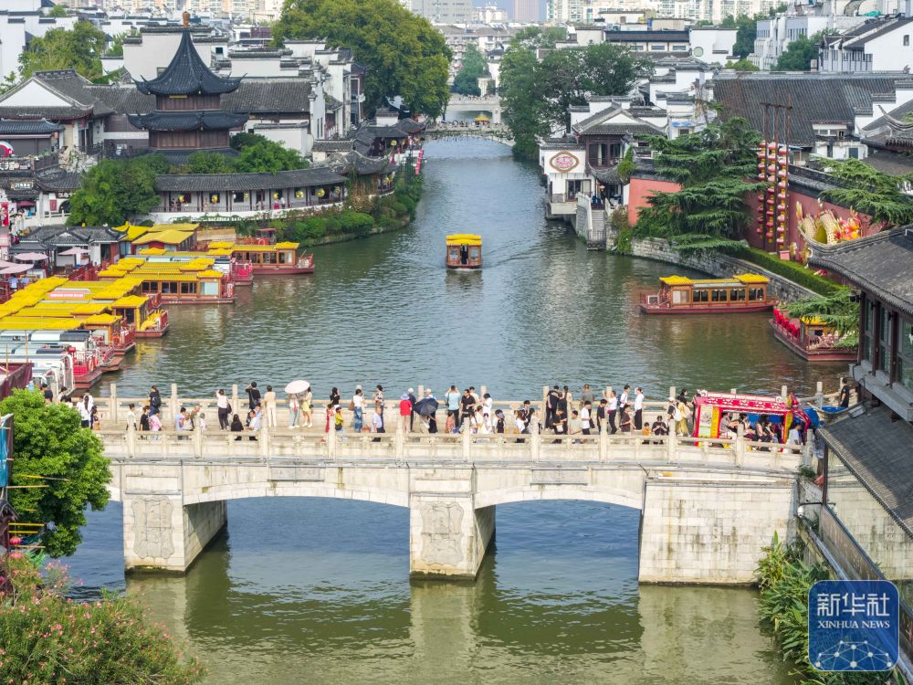 ↑ 10月6日,游客在江蘇省蘇州市吳江區(qū)同里古鎮(zhèn)游覽(無人機(jī)照片)。新華社發(fā)(周社根攝)