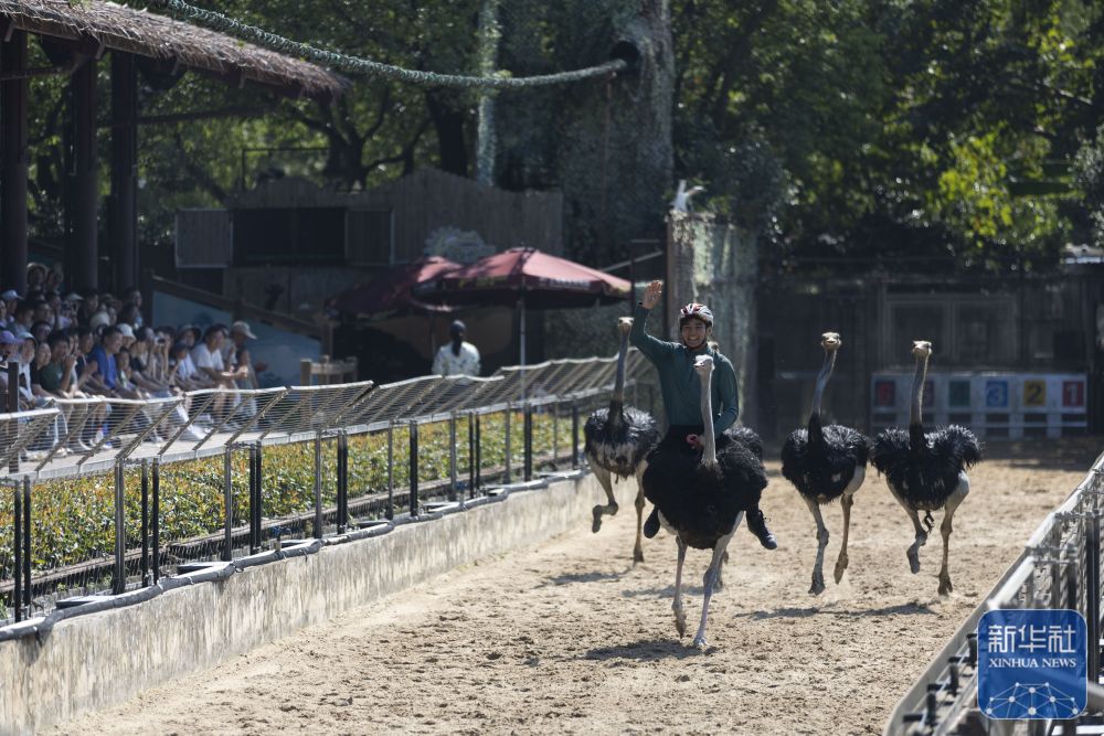 ↑ 10月6日,人們?cè)谏虾R吧鷦?dòng)物園觀看奔跑中的鴕鳥。新華社記者 王翔 攝