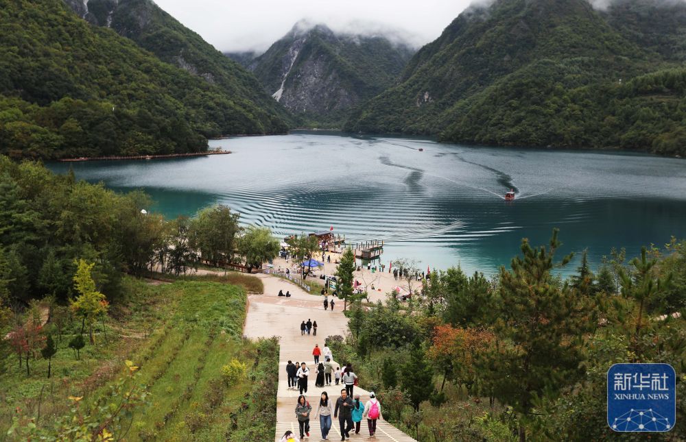 ↑ 10月6日,游客在甘肅省隴南市文縣境內(nèi)的天池景區(qū)游玩。新華社發(fā)(王克賢攝)