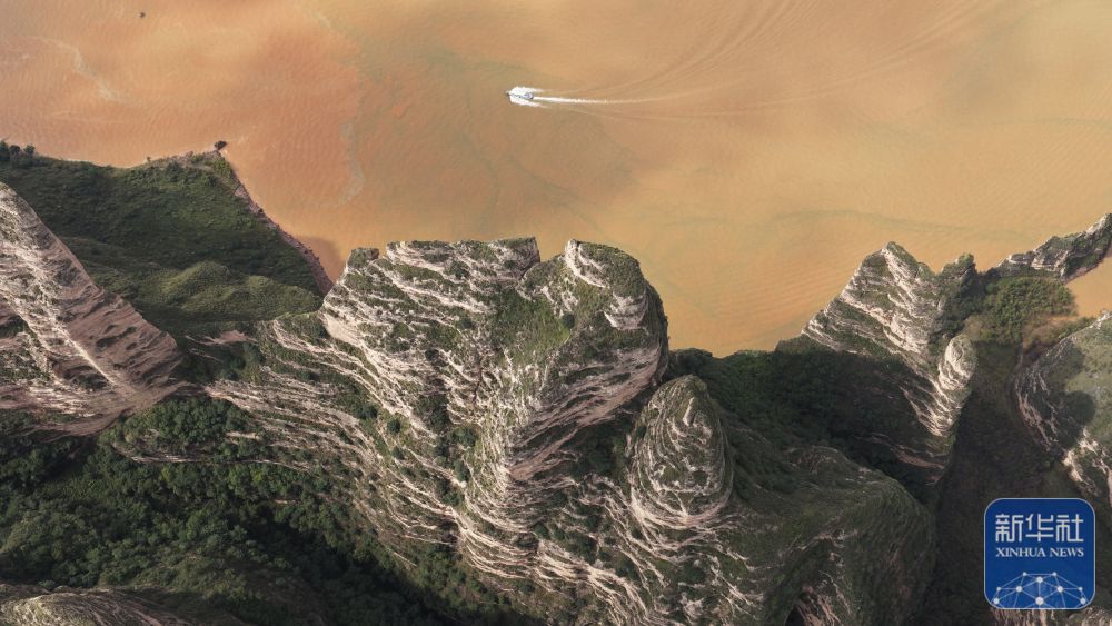 ↑ 10月6日,游客乘船在甘肅炳靈丹霞國(guó)家地質(zhì)公園游覽(無人機(jī)照片)。新華社發(fā)(史有東攝)