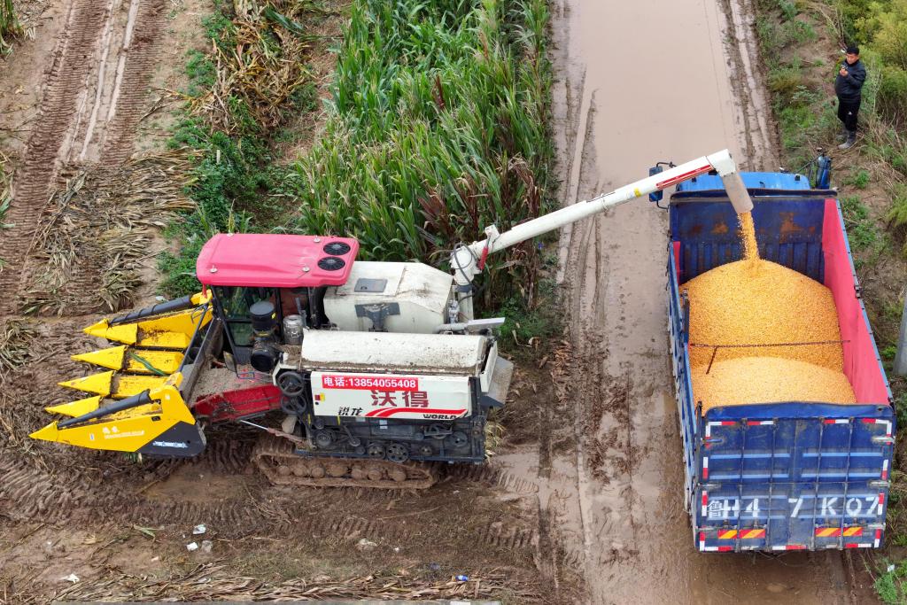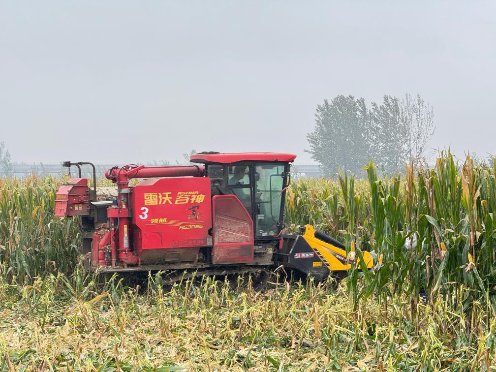 2025年10月11日,在安徽省淮北市濉溪縣百善鎮(zhèn)張莊村,從河南駐馬店調運過來的履帶式收割機在收割玉米。新華社發(fā)(徐弘揚 攝)