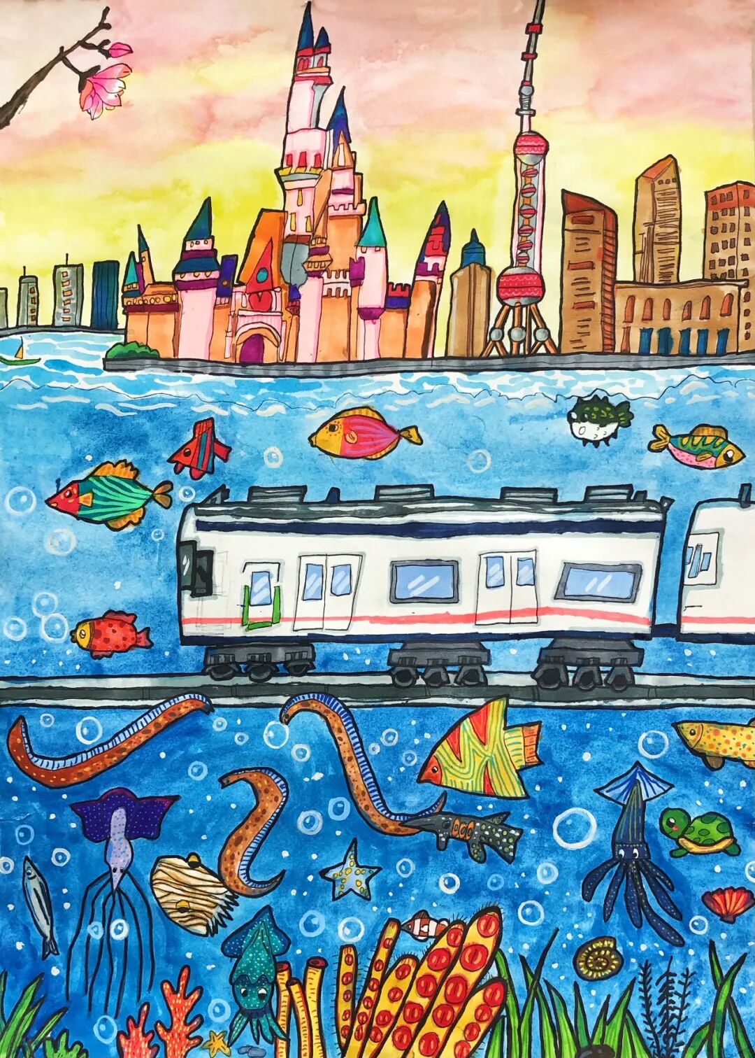 不遠處徐鹽高鐵上,銀白色的高鐵像一道流星劃過水鄉(xiāng)。我的鉛筆在本子上沙沙作響,把窗外的景色畫下來:成片的藕田里,粉白的荷花搖曳生姿;戴著斗笠的農(nóng)民在稻田里忙碌,身后的水渠泛著粼粼波光。列車員阿姨推著小推車走來,“瓜子飲料礦泉水”的吆喝聲,和車輪與鋼軌的碰撞聲交織在一起,成為獨屬于旅途的音樂。
