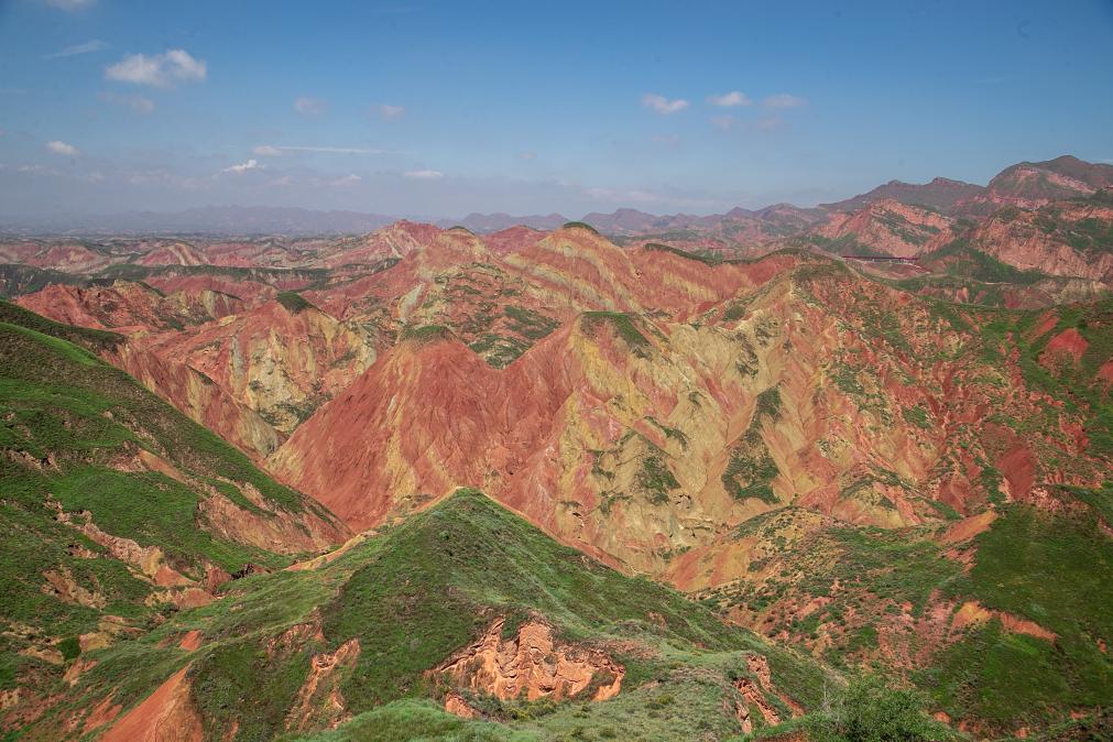 漫步景區(qū),放眼望去,紅色與青灰色交錯(cuò)分布,恍若置身于一幅水墨丹青中。移步登高,起伏的“彩丘海浪”直通天際?!叭嗽诋嬛杏?,我從景中來?!边@是不少游客的感受。