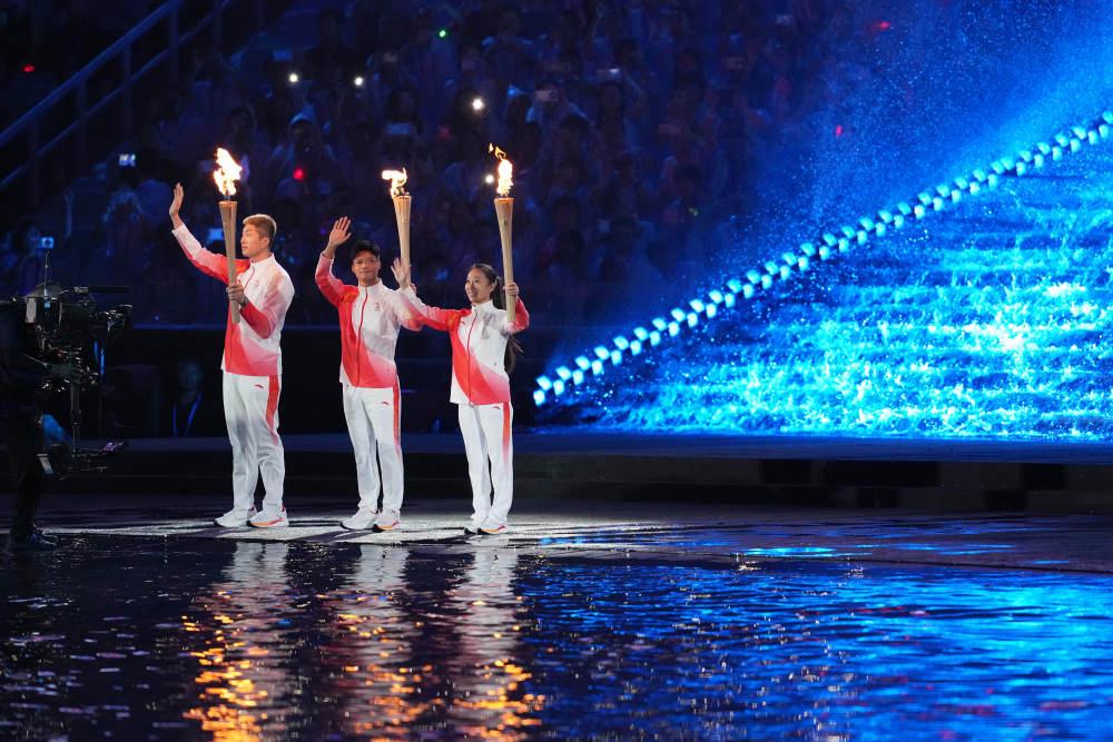 11月9日,火炬手蘇炳添(中)、張家朗(左)、李祎點(diǎn)燃主火炬后向觀眾致意。新華社記者肖藝九 攝