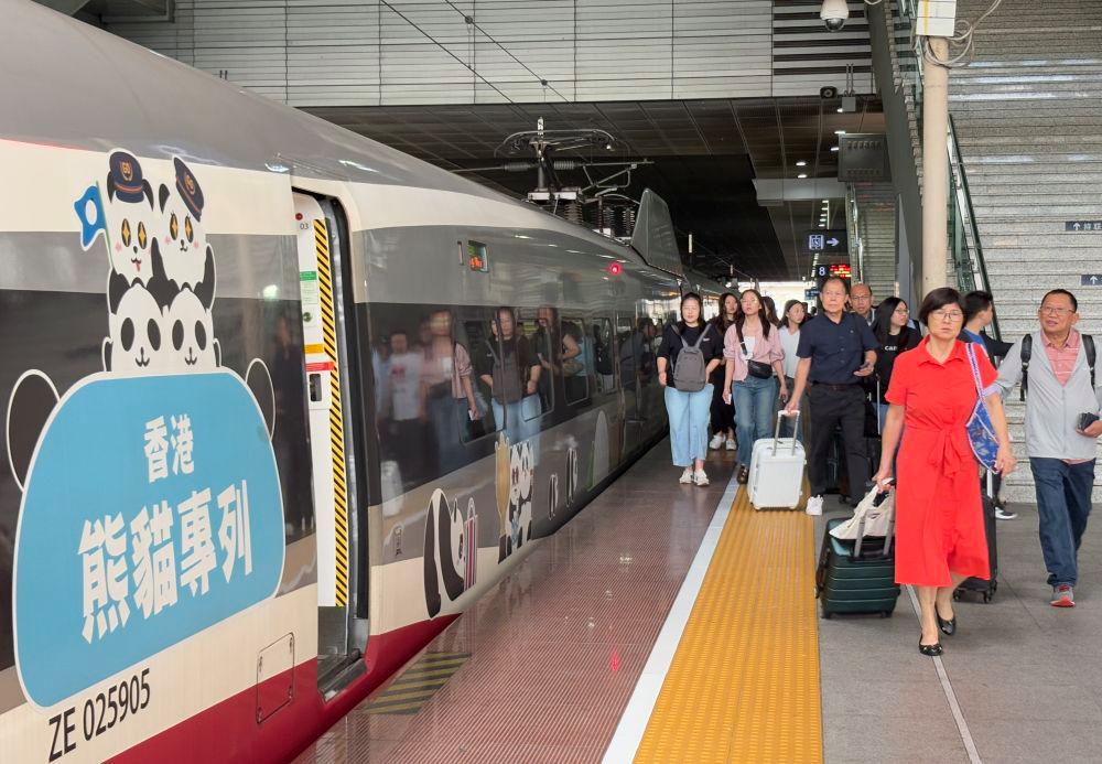4月27日,往返深港的高鐵列車(chē)??吭谏钲诒闭菊九_(tái)。新華社發(fā)