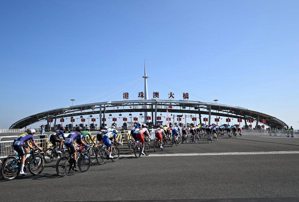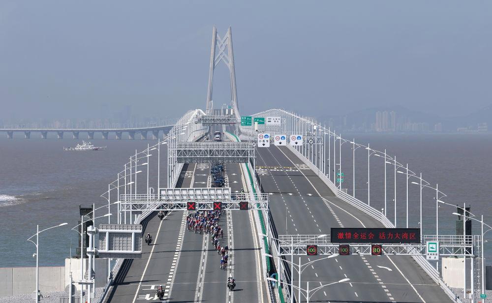 11月8日,在第十五屆全國(guó)運(yùn)動(dòng)會(huì)公路自行車(chē)男子個(gè)人賽決賽中,參賽選手在港珠澳大橋騎行。新華社記者梁旭 攝