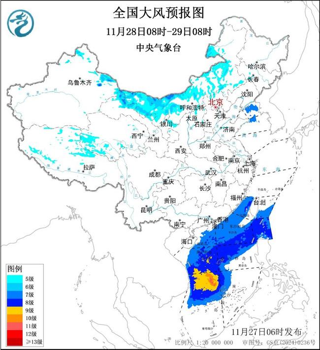 預(yù)計,11月27日08時至28日08時,新疆東部、內(nèi)蒙古中西部、甘肅西部、寧夏北部、山東半島、江蘇沿海以及青海西南部、西藏中西部等地有5~7級大風(fēng),陣風(fēng)8~9級,其中新疆東部山口地區(qū)、內(nèi)蒙古西部部分地區(qū)風(fēng)力可達8級,陣風(fēng)9~10級;11月27日08時至28日08時臺灣海峽、巴士海峽、南海北部和中東部海域?qū)⒂?級、陣風(fēng)9級的東北風(fēng),其中南海中西部和西南部海域的風(fēng)力可達10級、陣風(fēng)11級,南海中東部海域的風(fēng)力可達9級、陣風(fēng)10級,南海東南部海域?qū)⒂?級、陣風(fēng)9級的東南風(fēng)。