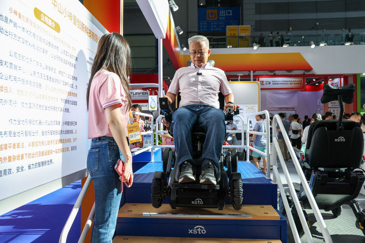 2025年9月12日,在2025深圳國(guó)際智慧養(yǎng)老產(chǎn)業(yè)博覽會(huì)上,觀眾在展會(huì)現(xiàn)場(chǎng)體驗(yàn)一款可以上下樓梯的智能出行機(jī)器人。新華社記者 梁旭 攝