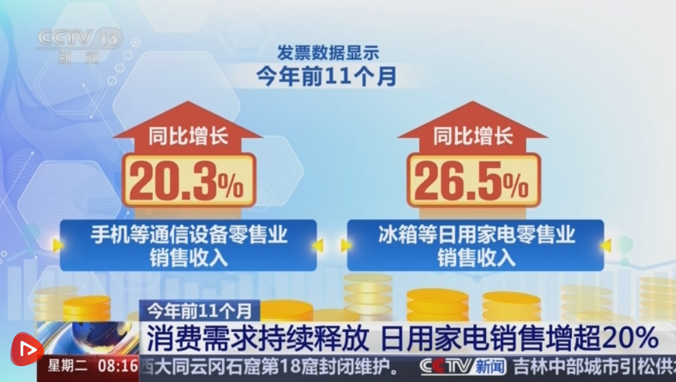 發(fā)票數(shù)據(jù)顯示,2025年前11個月,手機等通信設(shè)備零售業(yè)、冰箱等日用家電零售業(yè)銷售收入同比分別增長20.3%、26.5%。新能源汽車消費也持續(xù)向好,新能源乘用車銷售收入同比增長19.1%。同時,文旅市場新業(yè)態(tài)新場景不斷涌現(xiàn),激發(fā)消費活力持續(xù)增強。