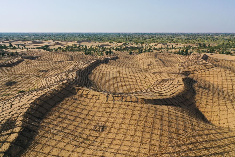 這是2025年9月12日在內(nèi)蒙古鄂爾多斯市拍攝的正在治理中的庫布其沙漠(無人機(jī)照片)。新華社記者 李志鵬 攝