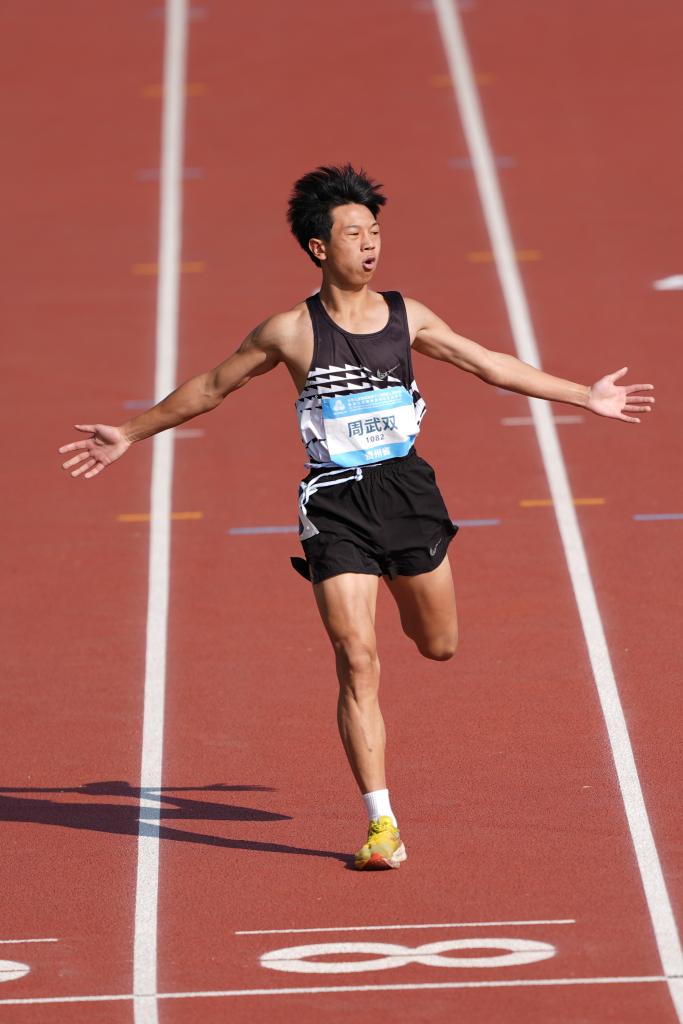 12月12日,貴州隊選手周武雙在男子12-15歲組400米預(yù)賽第4組比賽中,即將沖過終點時慶祝。新華社記者 楊晨光 攝