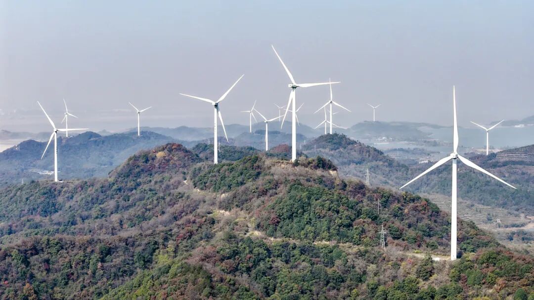 12月3日,在江西九江市湖口縣舜德鄉(xiāng)高橋村,風(fēng)力發(fā)電機(jī)組矗立青山間,不斷輸送綠色清潔能源。張玉攝