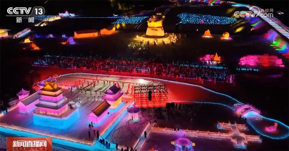 臨近零點(diǎn),一場融合科技光影與民族歌舞的跨年演出在晶瑩閃爍的冰雕舞臺上精彩亮相。