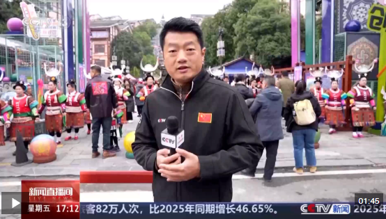 總臺(tái)記者 尹平:在位于貴州省黔東南州凱里市的繡里淘非遺集市門(mén)口,當(dāng)?shù)厝罕姶灯鹛J笙,擺起攔門(mén)酒,用自己豐富多彩的民族文化和琳瑯滿(mǎn)目的非遺技藝迎接新年,歡迎大家來(lái)過(guò)新年。