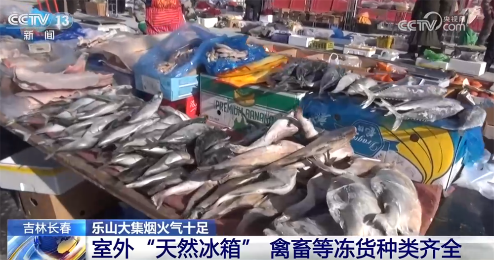接著往里走,這里就是東北特色十足的生鮮凍貨區(qū)了。長(zhǎng)春的冬天,室外零下20多攝氏度,堪稱(chēng)“天然大冰箱”。您看這凍魚(yú)、凍豆包凍得老硬了,還有凍梨、凍柿子,都是東北人節(jié)慶團(tuán)圓必備的滋味,化透之后一口咬下去滿(mǎn)是汁水,清甜可口。