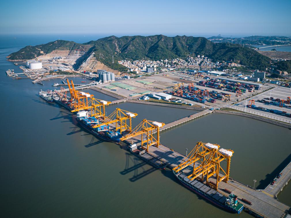 貨輪??吭跍刂莞蹱钤b箱碼頭卸載集裝箱(無人機照片)。新華社記者江漢 攝