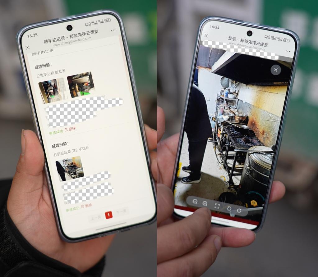 圖為騎手展示的“鄭騎先鋒隨手拍”手機操作頁面(拼版照片)。新華社記者 孫清清 攝