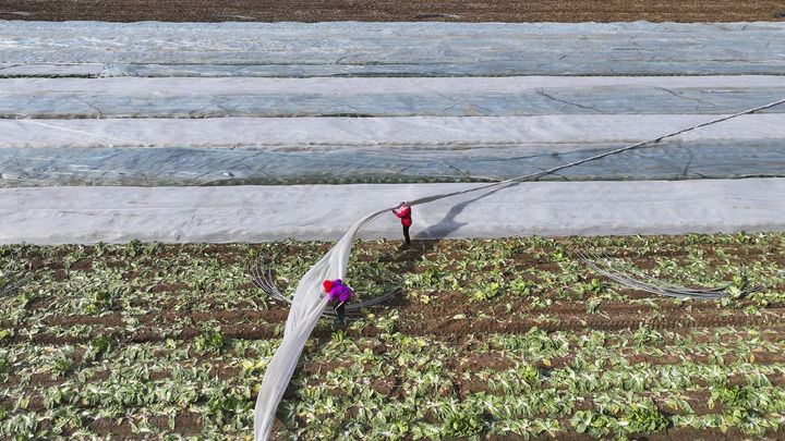 2025年12月11日,在山東省東營市廣饒縣李鵲鎮(zhèn),農(nóng)民為作物覆蓋防寒無紡布,應(yīng)對寒潮(無人機(jī)照片)。