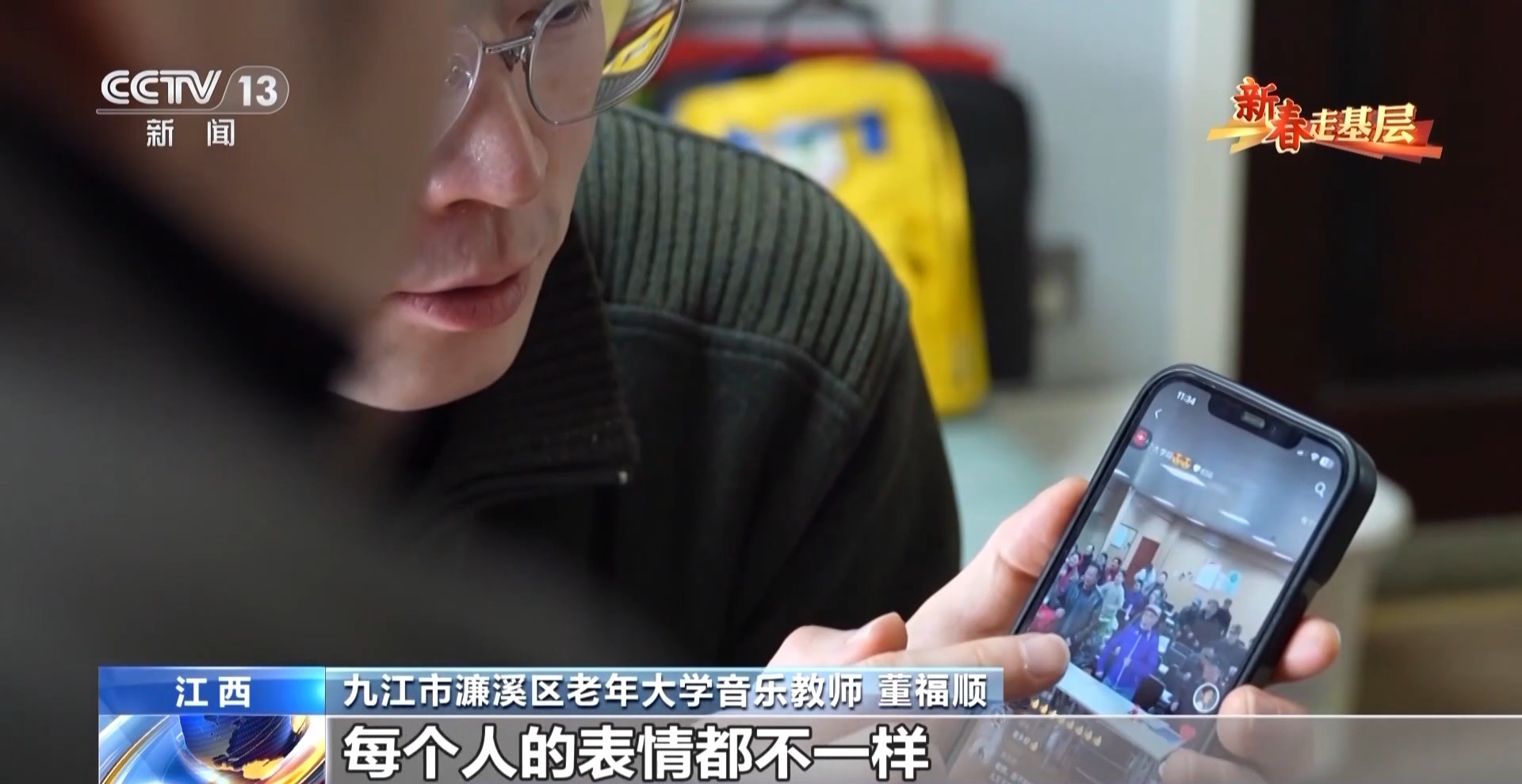 董福順在大學學的是聲樂,在九江市老年大學已經(jīng)當了9年的音樂老師。這個臘月趁著老年大學放假,他把課堂搬進了社區(qū)、村莊和養(yǎng)老院,免費帶大家上課。