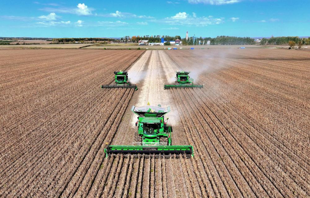 2025年9月29日,在北大荒集團黑龍江尾山農(nóng)場有限公司第一管理區(qū),農(nóng)機進(jìn)行大豆收獲作業(yè)(無人機照片)。新華社發(fā)(陸文祥攝)