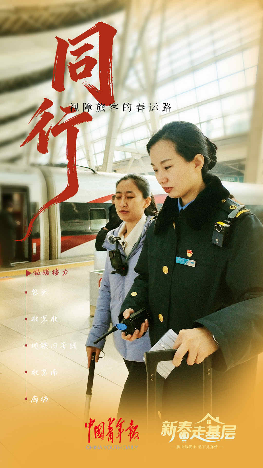 這一路,全程參與接力的鐵路、地鐵工作人員,有十余人。北京北站的工作人員說,春運期間,日均服務重點旅客50至100人。