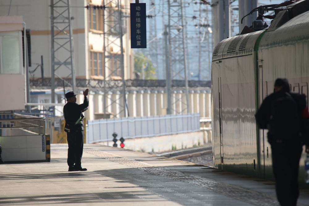 ↑ 2月16日,在南京火車站,乘務(wù)人員在站臺(tái)上解答旅客問詢。新華社發(fā)(蘇陽攝)