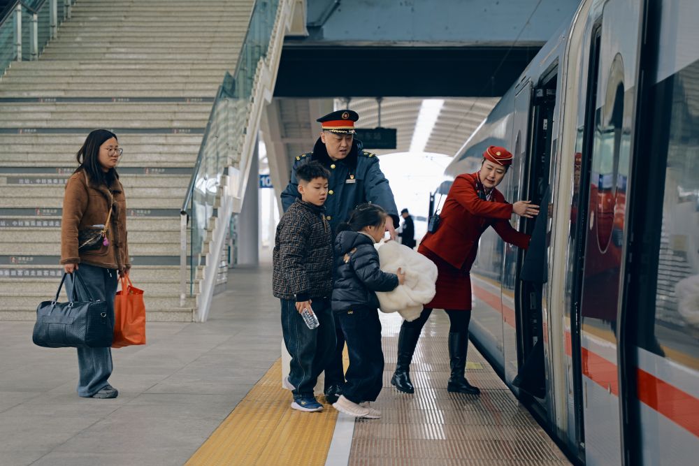 ↑ 2月16日,鐵路徐州東站工作人員協(xié)助旅客上車。新華社發(fā)(張光磊攝)