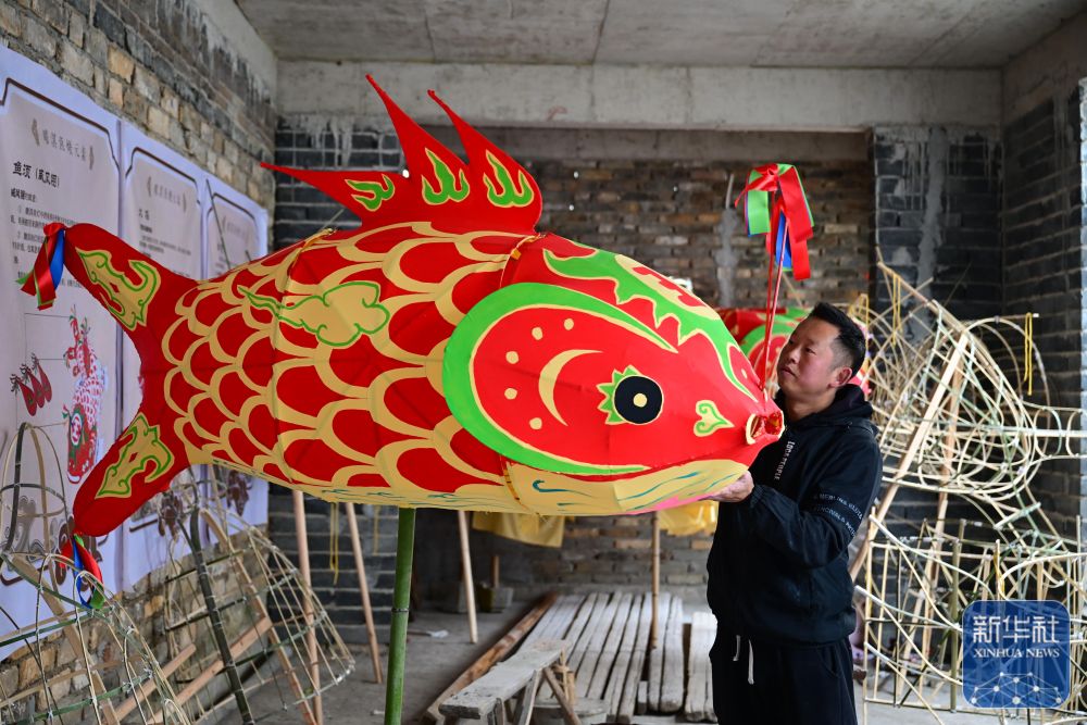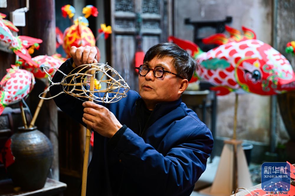 1月29日,瞻淇村的市級(jí)非遺項(xiàng)目魚燈代表性傳承人汪近午在制作魚燈。