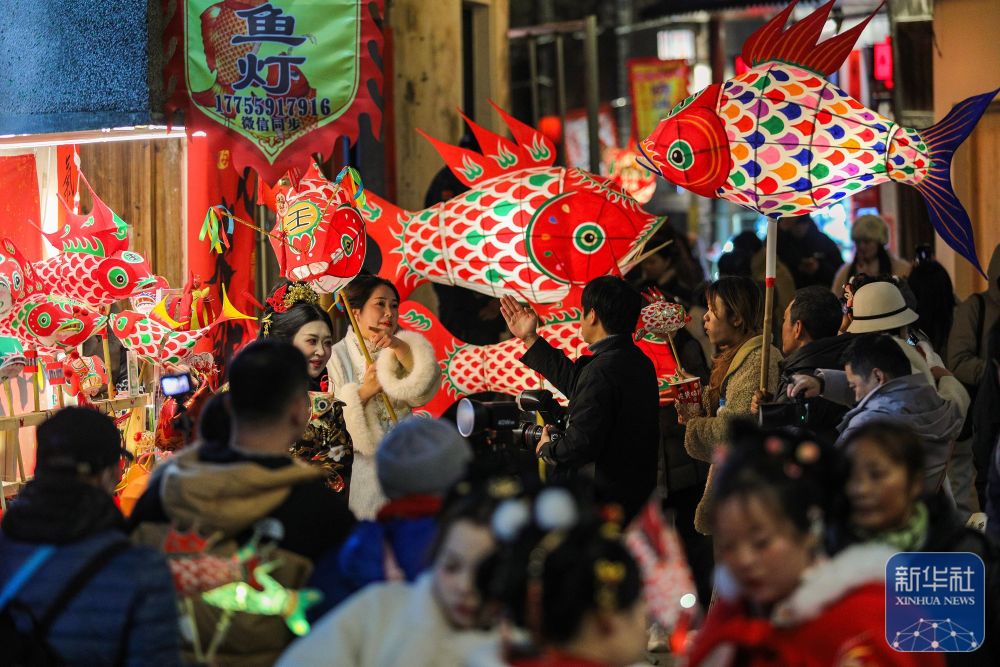 2月7日,游客在瞻淇村和魚燈合影。