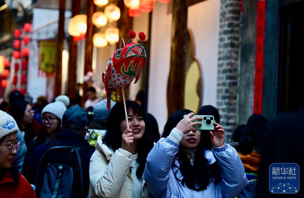 2月7日,游客在瞻淇村里體驗(yàn)魚燈表演。