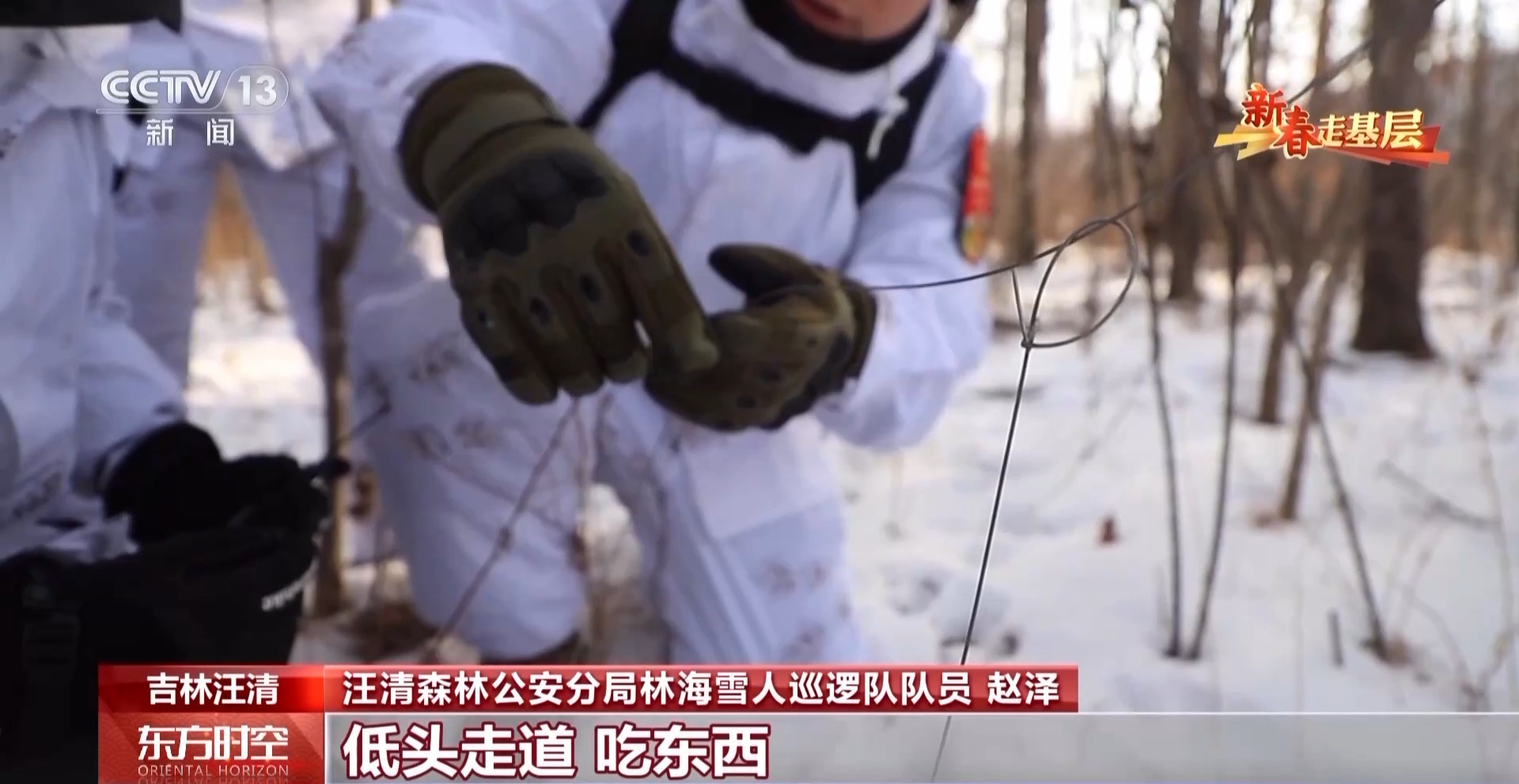 汪清森林公安分局林海雪人巡邏隊隊員 趙子越:原地不動,然后往后撤。倒著往后撤,你不要轉身背對著它往外跑。一點點往后撤,我們離它保持一定安全距離以后,我們再放一些鞭炮什么的。