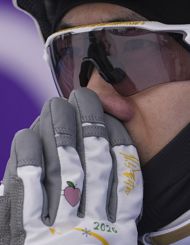 2月20日,王心迪在比賽后慶祝奪冠。他雙手戴著一“桃”一“心”。新華社記者 鄔惠我 攝