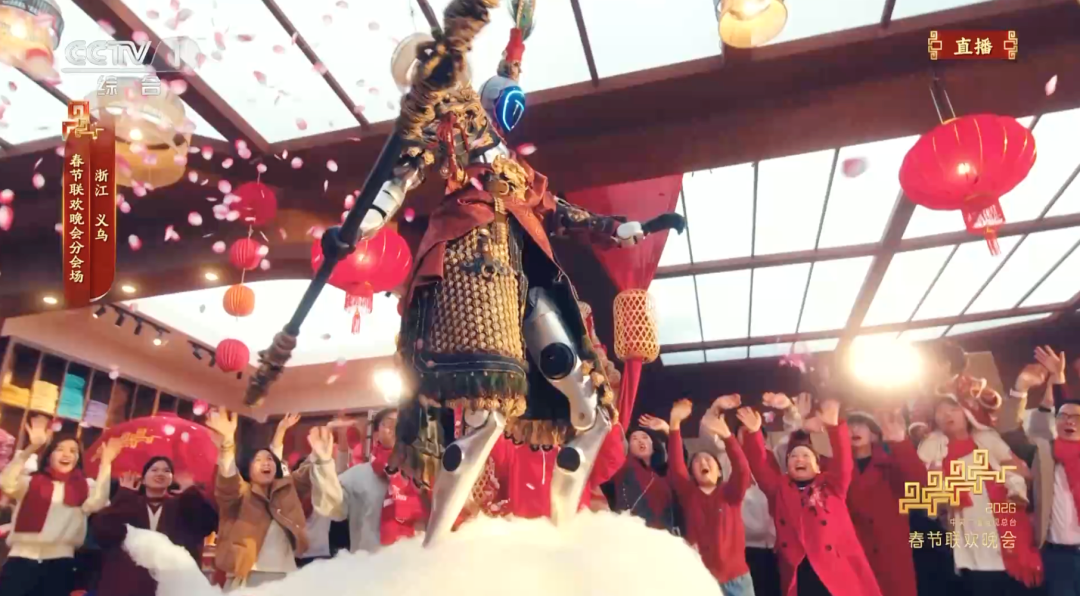 義烏分會(huì)場(chǎng),演員張若昀與披上《黑神話:悟空》戰(zhàn)袍的浙江新特產(chǎn)——宇樹(shù)機(jī)器人熱情互動(dòng)。機(jī)器人化身“大圣”駕著“筋斗云”從天而降的畫(huà)面,引得網(wǎng)友直呼驚艷。