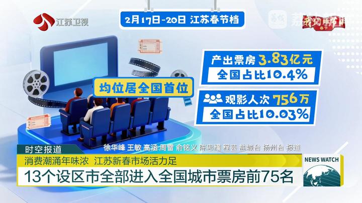 電影票房是文化消費活力的風(fēng)向標(biāo)。截至目前,全國春節(jié)檔電影總票房已突破40億元。作為全國票倉,江蘇電影市場持續(xù)領(lǐng)跑全國:2月17日至20日,江蘇產(chǎn)出票房超3.83億元,全國占比10.4%;觀影人次超756萬,全國占比10.03%,票房和人次均位居全國首位。放眼全國,江蘇展現(xiàn)出“萬馬奔騰”的票房趨勢,13個設(shè)區(qū)市全部進入全國城市票房前75名,蘇州、南京、南通、無錫、鹽城五市進入全國前20名。