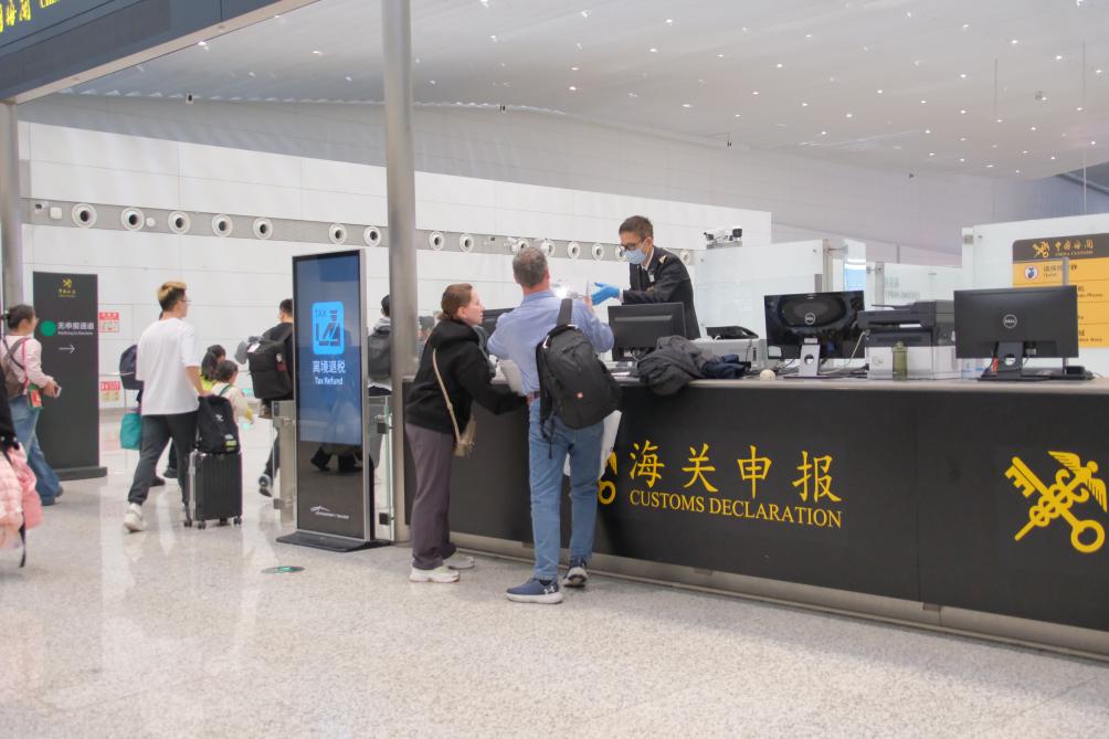 2月23日,廣州白云機場海關(guān)關(guān)員在出境申報臺為旅客辦理離境退稅驗核業(yè)務(wù)。(受訪者供圖)