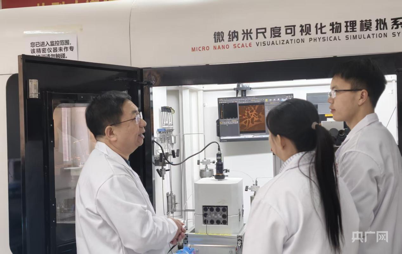 吳景春(左一)與團(tuán)隊(duì)成員正在討論頁(yè)巖油采收技術(shù)(央廣網(wǎng)記者 陳顯春 攝)