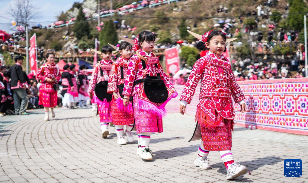 2月26日,在貴州省六盤水市六枝特區(qū)梭戛苗族彝族回族鄉(xiāng)高興村跳花場,小朋友們在進行巡游。