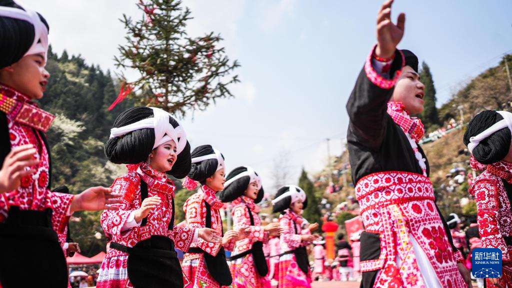 2月26日,在貴州省六盤水市六枝特區(qū)梭戛苗族彝族回族鄉(xiāng)高興村跳花場,苗族群眾在演唱歌曲。