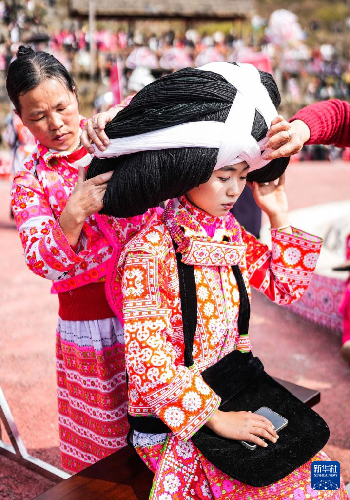 2月26日,在貴州省六盤水市六枝特區(qū)梭戛苗族彝族回族鄉(xiāng)高興村跳花場,苗族姑娘在整理頭飾。