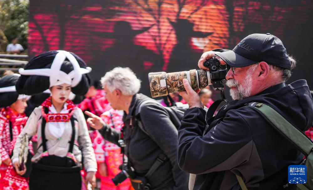 2月26日,在貴州省六盤水市六枝特區(qū)梭戛苗族彝族回族鄉(xiāng)高興村跳花場,國外游客在拍照。