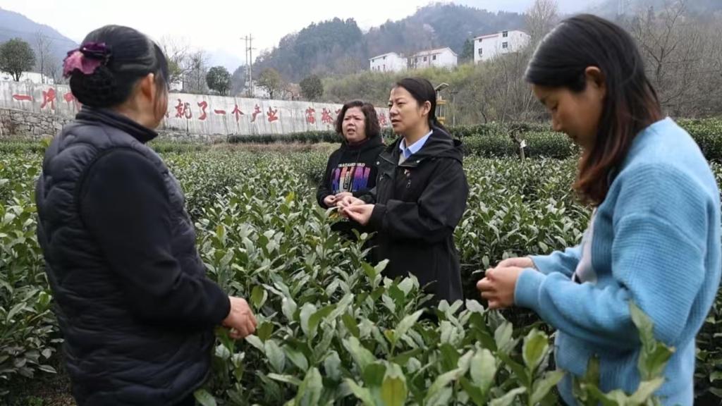 全國(guó)政協(xié)委員、安徽省金寨縣花石鄉(xiāng)大灣村黨總支第一書(shū)記余靜(右二)在茶園里和茶農(nóng)們交流。(受訪者供圖)