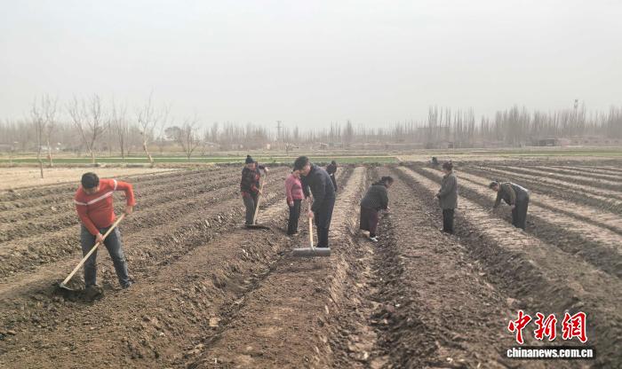 楊永鵬(中)與種植戶(hù)一起春耕。受訪(fǎng)者供圖