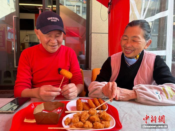 3月11日,臺(tái)胞劉韋麟(左)與妻子吳微微一邊品嘗自制的臺(tái)灣小吃一邊聊天。中新社記者 岳依桐 攝