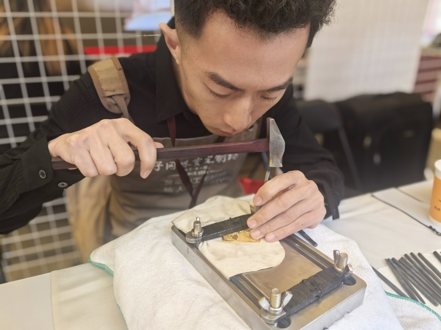 回到現(xiàn)場,95后工匠郭珺文正在演示鏨刻——這是打金中最顯手藝的環(huán)節(jié)。鏨刻臺上,金器被固定,他手持小榔頭敲擊鏨刻刀,“叮叮當當”一點一點敲出紋樣?!耙话阋?jīng)過幾萬次,才能達到預期效果。”他說。攤位前,幾位上海阿姨湊近仔細圍觀,問道:“蠻靈,黃金有損耗伐?”