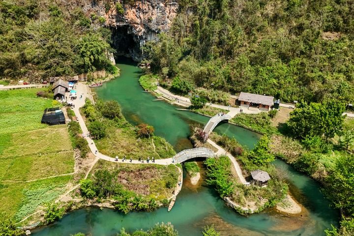 2026年3月17日,游客在云南省文山壯族苗族自治州廣南縣壩美景區(qū)游覽(無人機(jī)照片)。近年來,當(dāng)?shù)厣钊胪诰驂蚊来遛r(nóng)文旅融合發(fā)展?jié)摿?,一方面打造沉浸式旅游體驗項目,讓游客在欣賞自然風(fēng)光的同時,感受壯鄉(xiāng)傳統(tǒng)農(nóng)耕文化;另一方面景區(qū)積極吸納本地村民就業(yè),鼓勵其因地制宜創(chuàng)業(yè)增收,推動農(nóng)業(yè)與旅游業(yè)互促共進(jìn)。新華社記者 彭奕凱 攝